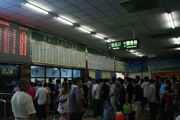 |   重慶駅ホテルを出ると大通りを隔てた対面が重慶駅。ちょっと駅名のネオンが壊れているが。この重慶駅に並んで正面左側に重慶汽車駅(バスターミナル)がある。 |   重慶汽車駅(バスターミナル)重慶汽車駅に着くともう既にお客で満員。切符売場(售票处)には長々と列が出来ていったいいつ切符が買えるかわからない。 |