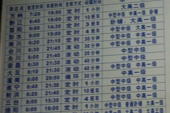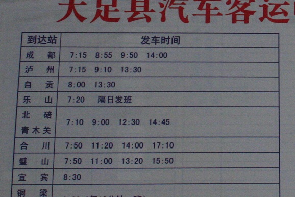 バスに乗ると西進する。右手の山々に住宅団地が見える。重慶市内のもう一箇所のバス駅にも停車する。始発駅からは指定席だが途中駅からの乗車は自由席だ。渝昆高速を西進し邮亭高速出口まで1.5時間、ここから重慶大足汽車駅までさらに1時間で合計2.5時間である。昨日の火鍋のせいで胃が重い。バスの中では腹の調子が気になって仕方なかったが、大足に着くころにはなんとかおさまっていた。 |   大足県汽車客運中心の時刻表終着駅の重慶大足汽車駅で下車。「成都行のバスはここからか」と運転手に聞くと、ここではなく「新車駅」発だという。早速タクシーを捕まえて「新車駅」へ向かってもらうとあっという間に着いた(後ほど地図を確認すると新車駅は重慶大足汽車駅の東600mの所にある橋を渡った所。)。タクシーの運転手に2時まで貸切(包車)でいくらかと聞くと250元と答えるので、なら結構と言ってタクシーを下車し新車駅(正確には『大足県汽車客運中心』という。)に荷物を預ける(寄存料2人の荷物全部で6元)。
