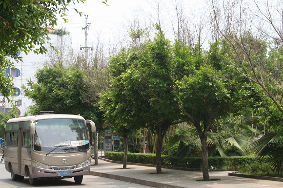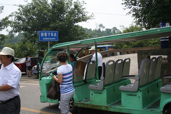 |   宝頂山石刻入口ここまでタクシーで送ってもらった(約20分で40元)。大足には、この宝頂山石刻の他に東山石刻と南山石刻があるが、我友によると「中国人はだれもそんな所にいかない、宝頂山を見たら帰る」とのことで、どこかでのんびり朝食を取ってからここを見学することにした。 |   電瓶車これが先日の成都の熊猫基地でも乗った「電瓶車」(往復3元)。大足もとても暑いのだがこの車に乗って風を切って走るのはとても気持ちが良い。。があっという間に大足石刻の入口に。 |