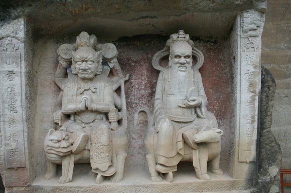 なお写真の桃は友達が近くの露店で購入したもの。中国のレストランは持ち込み自由(?)。 |   大足石刻商店街を抜けていくと宝頂山石刻の入口に着く。入場料(門票)は120元、入場時間は10:42。まずはこのように可愛い仏様がお出迎え。 |