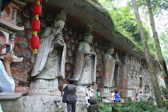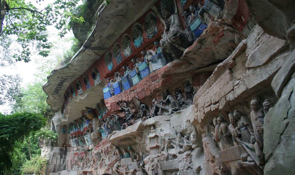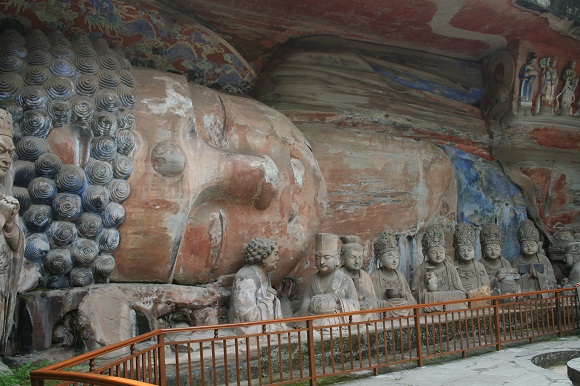 |   華厳三聖像1174~1252年に造られた高さ約8m、幅約15m、奥行約2mの彫刻。とても優雅で美しい。 |   釈迦涅槃聖跡図同じく1174~1252年に造られた高さ約7m、幅約32m、奥行約5mの彫刻。釈迦が寝ていてその前に弟子が並んでいる像は確か敦煌にもあった。 |