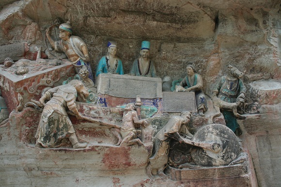 |   大方便仏報恩経変相高さ約7.3m、幅約15m,約奥行2mのこの彫刻はバチカンの「最後の審判」と同じ構図の仏教版。どちらが先に造られたのだろうか?真ん中に審判する人がいてその上には昇天した方々、そして下には。。 |  |