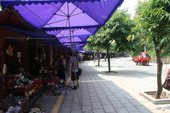 なおバチカンの「最後の審判」との大きな違いは、こちらでは天国へ行くか地獄へ行くかは何人かの審判員の合議制のようなこと。 |   大足石刻の出口の商店街大足石刻は、規模こそ小さかれ彫刻の内容は中国の三大石窟(敦煌、龍門、雲岡)に劣らない。なかなか迫力があり感動的だった。さすが世界文化遺産。 石刻を出るとこのような商店街を通りまた電瓶車に乗って駐車場に戻る。